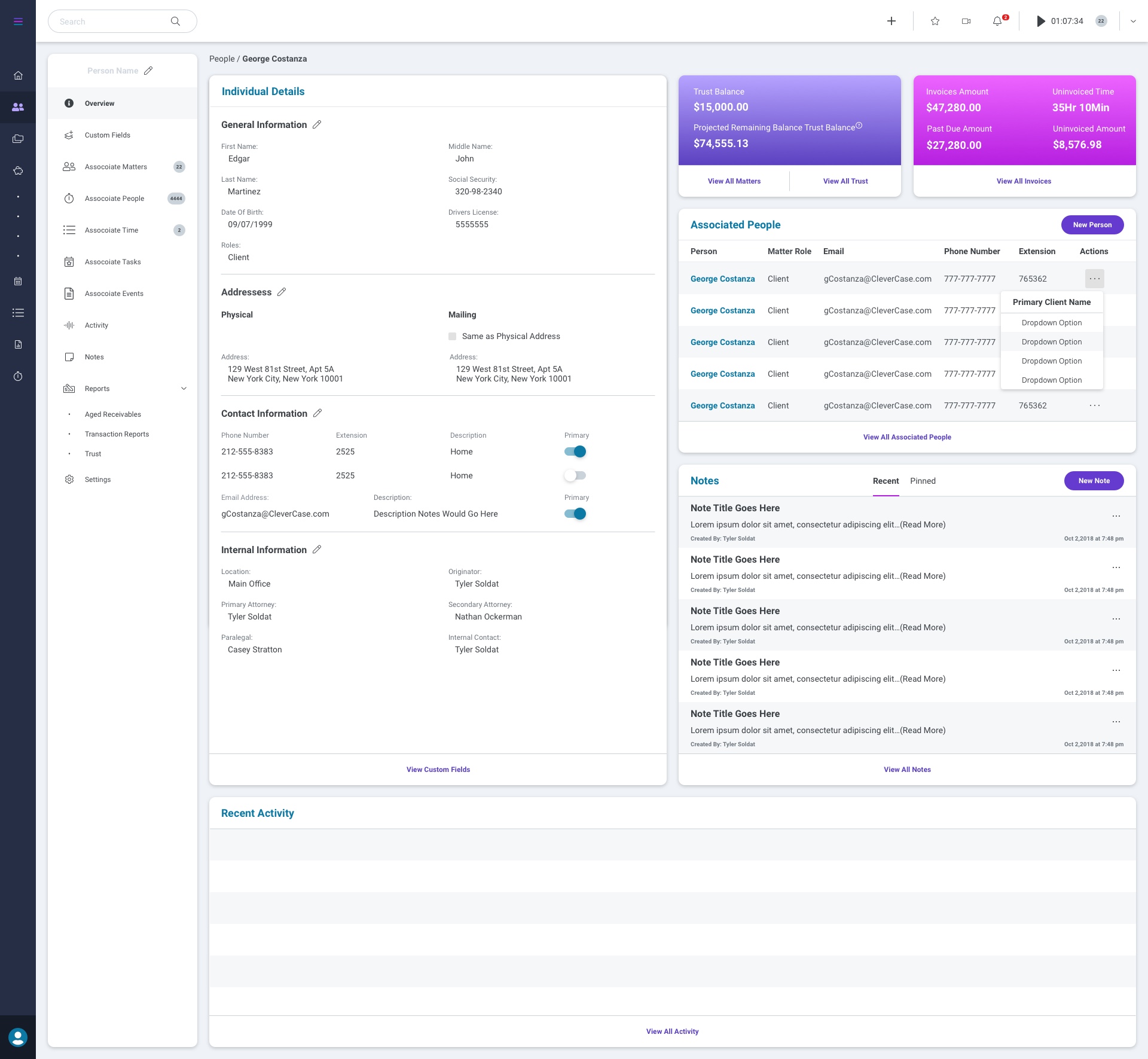 Keep track of all of your contacts within the people index. Records can be individuals or entities. Keep up-to-date information on all of your contact records including phone numbers, email addresses, mailing addresses, associated people, important information, associated documents, notes, tasks, and more.