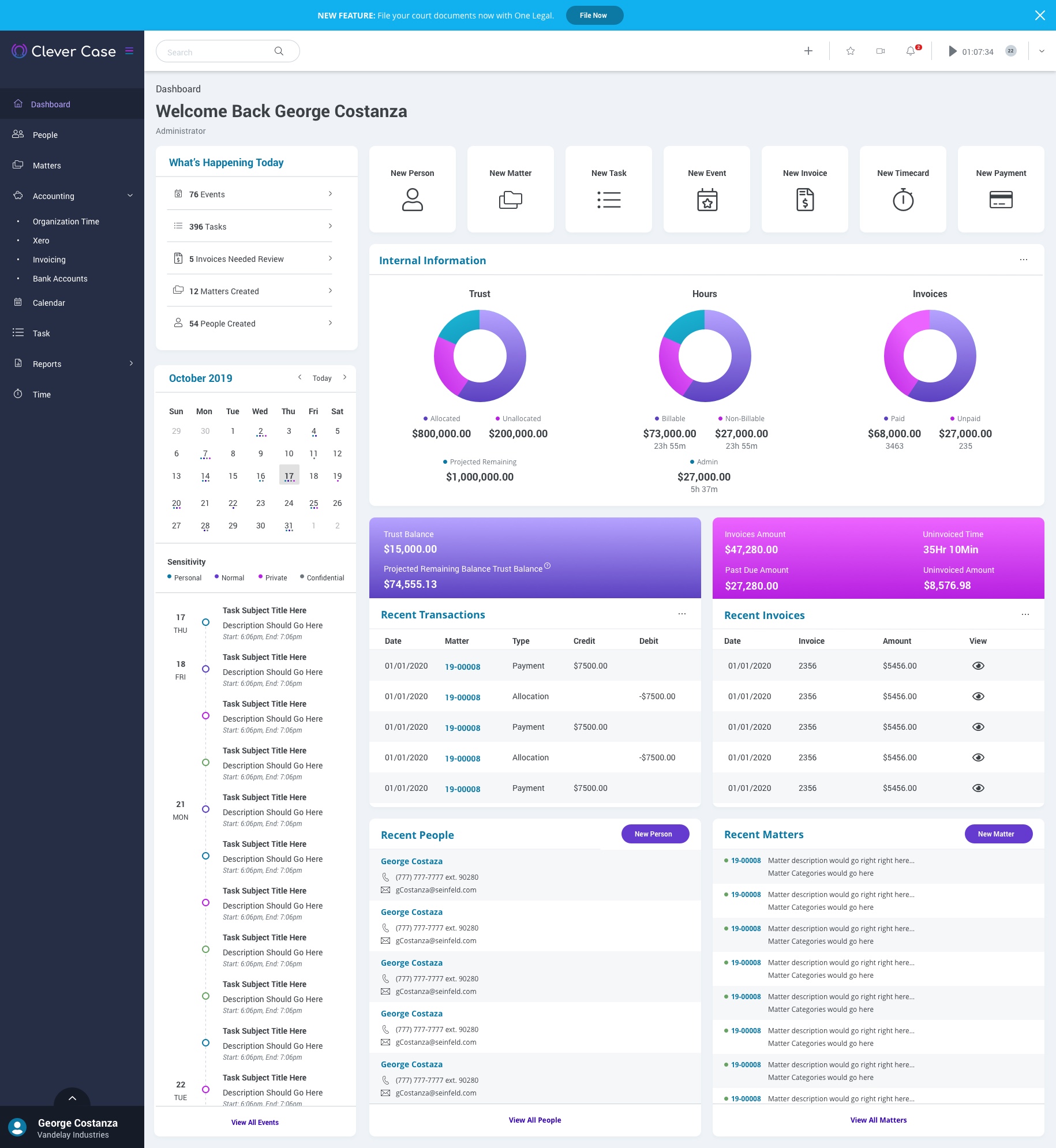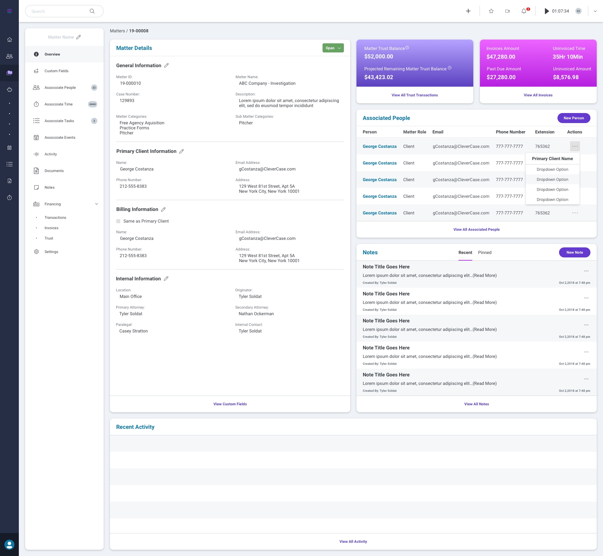 Matters can be organized by Category and Subcategory, include unique descriptions and case numbers, and more. Keep all notes, time tracking, documents, forms, tasks, and associated people in one place connected to unique cases, providing you with a means of elevated record management.