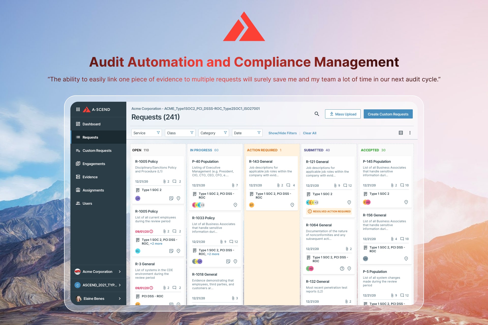 The A-SCEND compliance management solution merges intuitive software with extensive experience in multi-framework audits and compliance. This SaaS application guides you seamlessly through the entire audit lifecycle, from preparation to final reporting. Crafted by our team of experts and influenced by client feedback, A-SCEND offers the following benefits: