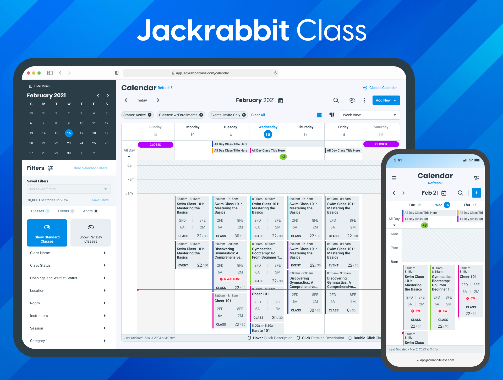 The existing calendar - which opens in a Week View- is the 7th most adopted feature in Jackrabbit Class. However, it struggles with compounded technical debt, lack of features, and usability across devices. To address these concerns, the Calendar will receive a facelift, a technology upgrade, improvements to existing features, and a suite of new features to differentiate Jackrabbit Class with competitors.